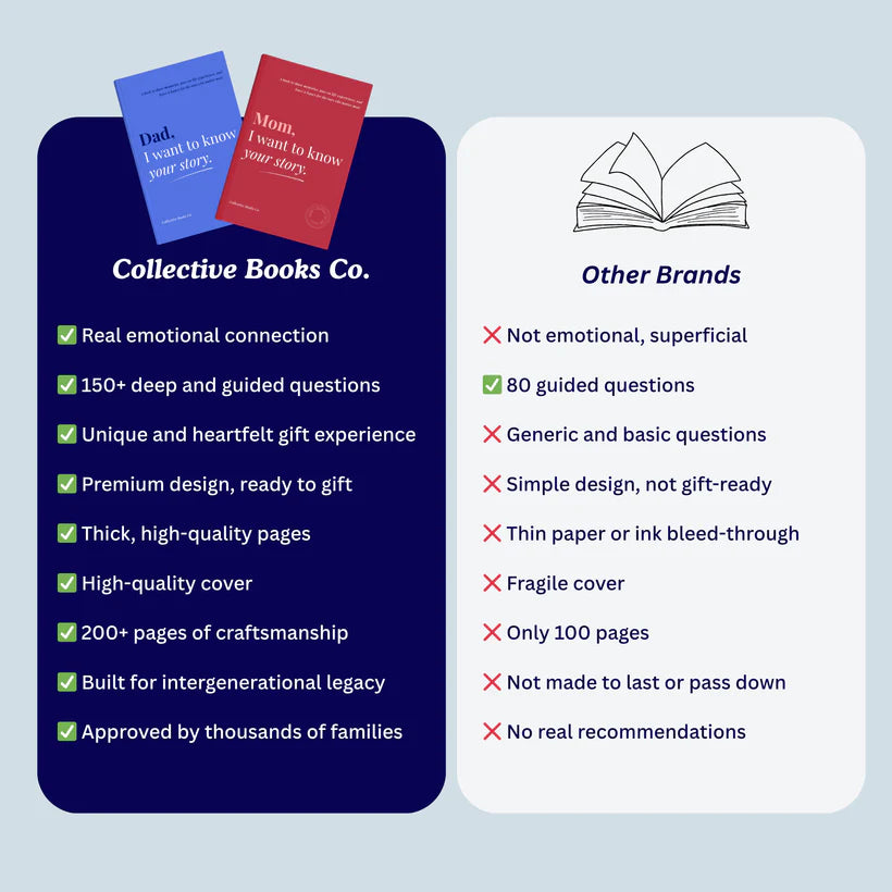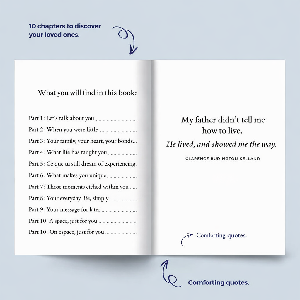 This unique guided journal invites them to share their memories, emotions, and the life lessons they wish to pass on. Page after page, they take the time to open up, remember, and put words to what truly matters.