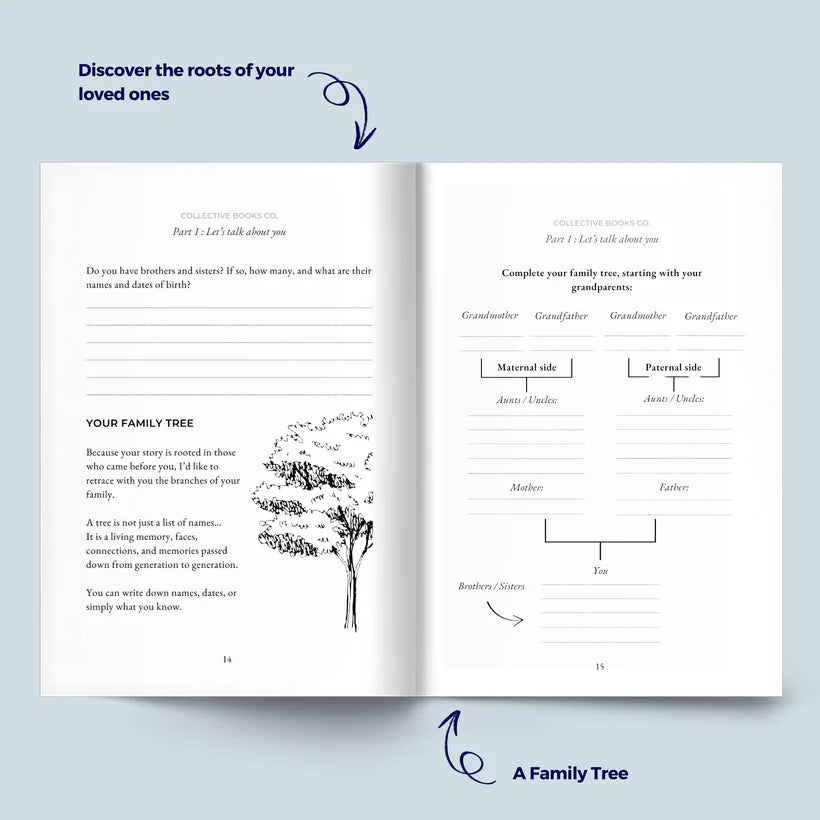📖150+ inspiring questions, a family tree, free pages, and space to preserve your photos